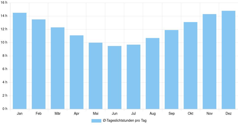 | Ø-Tageslichtstunden pro Tag | 14,5 | 13,5 | 12,3 | 11,1 | 10 | 9,5 | 9,7 | 10,7 | 11,9 | 13,1 | 14,3 | 14,8 |