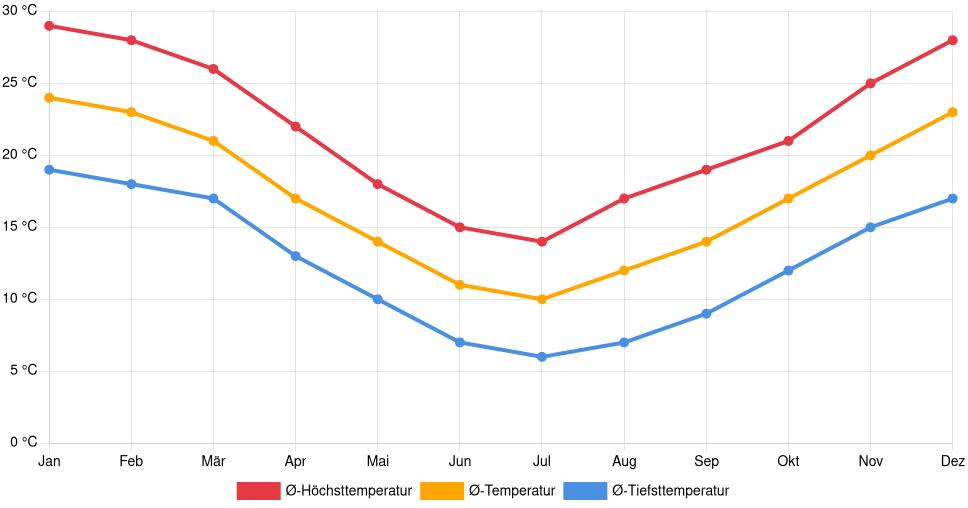 | Ø‑Höchsttemperatur | 29 °C | 28 °C | 26 °C | 22 °C | 18 °C | 15 °C | 14 °C | 17 °C | 19 °C | 21 °C | 25 °C | 28 °C |