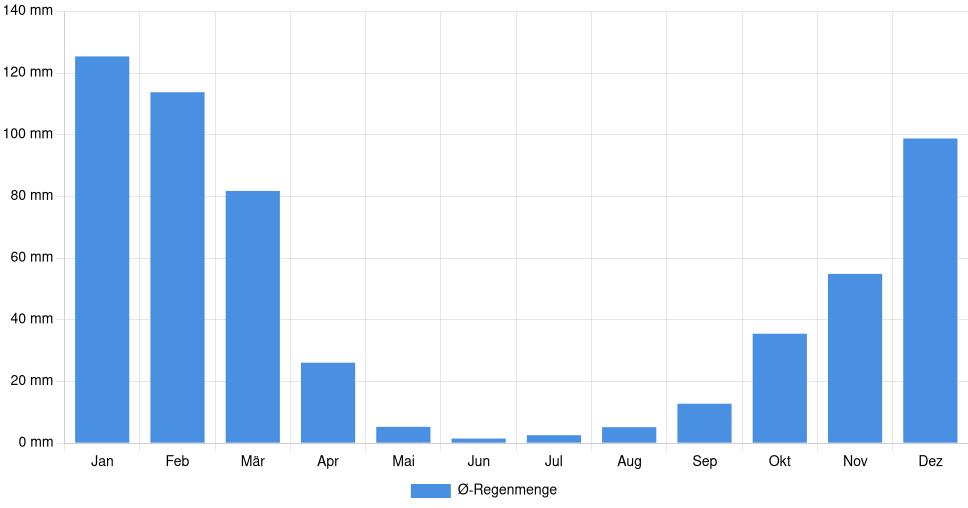 | Regenmenge | 125,4 mm | 113,8 mm | 81,8 mm | 26,1 mm | 5,3 mm | 1,5 mm | 2,6 mm | 5,2 mm | 12,8 mm | 35,5 mm | 54,9 mm | 98,8 mm |