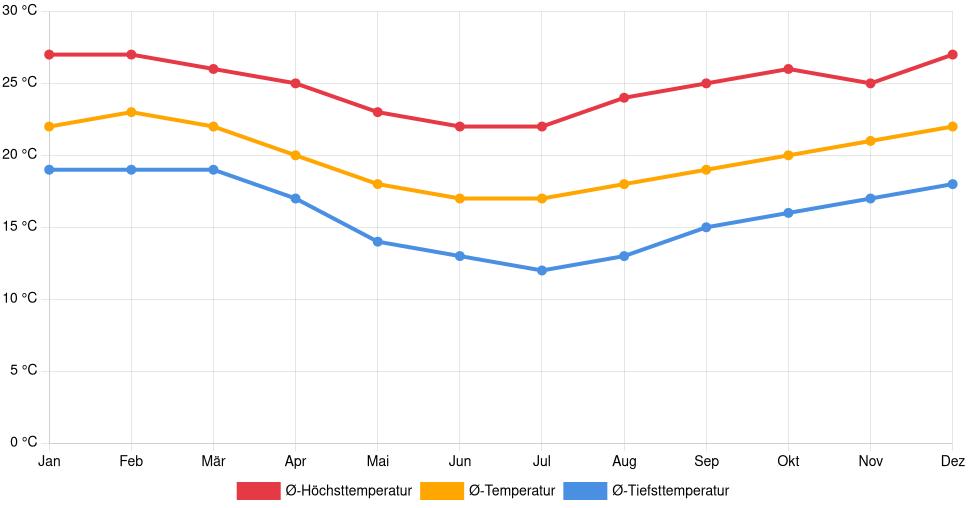 | Ø‑Höchsttemperatur | 27 °C | 27 °C | 26 °C | 25 °C | 23 °C | 22 °C | 22 °C | 24 °C | 25 °C | 26 °C | 25 °C | 27 °C |