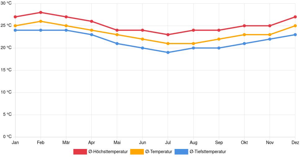 | Ø‑Höchsttemperatur | 27 °C | 28 °C | 27 °C | 26 °C | 24 °C | 24 °C | 23 °C | 24 °C | 24 °C | 25 °C | 25 °C | 27 °C |