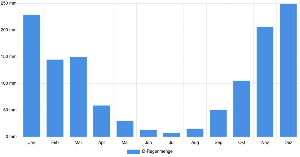 | Regenmenge | 228,9 mm | 145 mm | 149,7 mm | 58,9 mm | 30,3 mm | 13,5 mm | 7,7 mm | 15,4 mm | 50,3 mm | 105,5 mm | 206,2 mm | 248,9 mm |