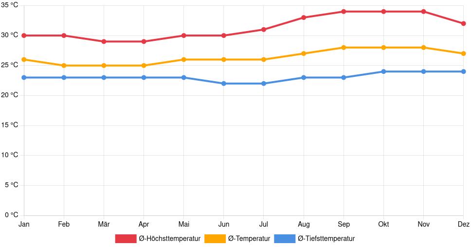 | Ø‑Höchsttemperatur | 30 °C | 30 °C | 29 °C | 29 °C | 30 °C | 30 °C | 31 °C | 33 °C | 34 °C | 34 °C | 34 °C | 32 °C |