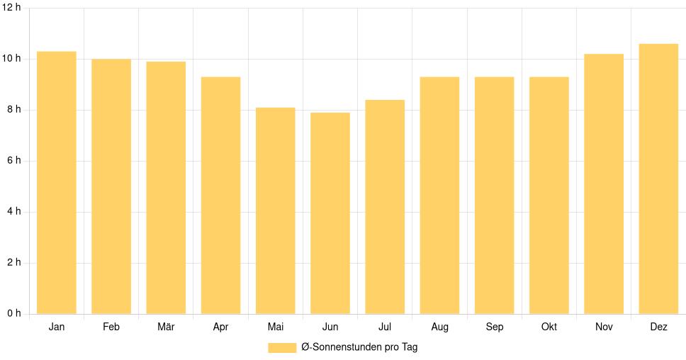 | Ø-Sonnenstunden pro Tag | 10,3 | 10 | 9,9 | 9,3 | 8,1 | 7,9 | 8,4 | 9,3 | 9,3 | 9,3 | 10,2 | 10,6 |