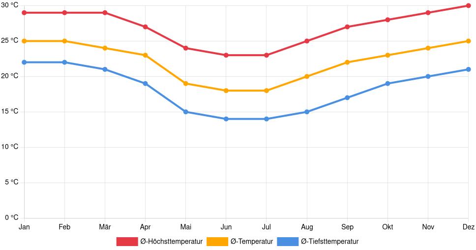 | Ø‑Höchsttemperatur | 29 °C | 29 °C | 29 °C | 27 °C | 24 °C | 23 °C | 23 °C | 25 °C | 27 °C | 28 °C | 29 °C | 30 °C |