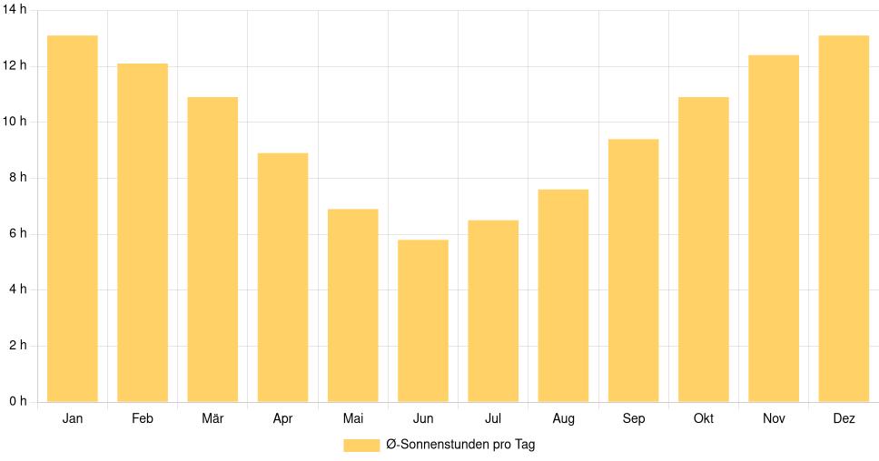 | Ø-Sonnenstunden pro Tag | 13,1 | 12,1 | 10,9 | 8,9 | 6,9 | 5,8 | 6,5 | 7,6 | 9,4 | 10,9 | 12,4 | 13,1 |