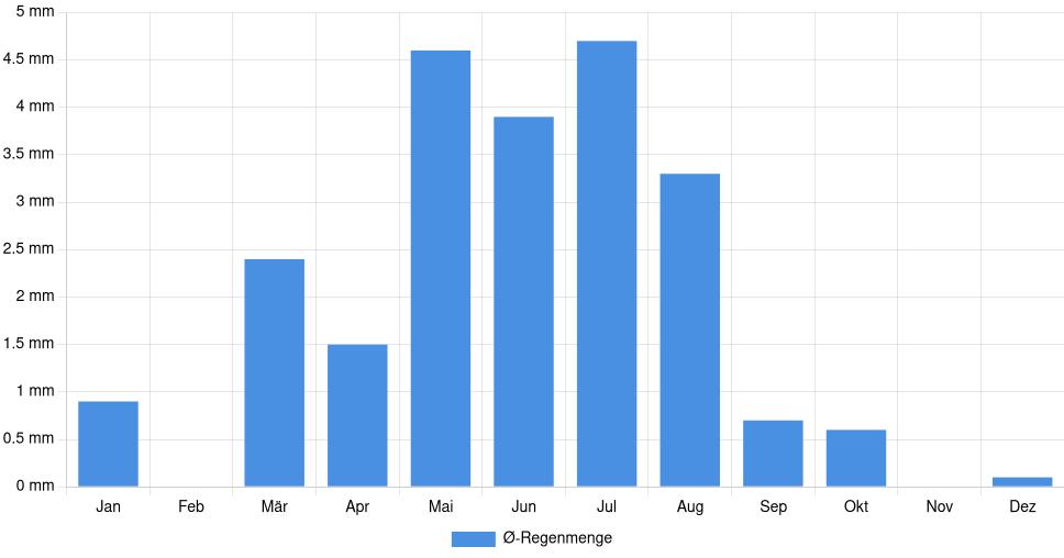 | Regenmenge | 0,9 mm | 0 mm | 2,4 mm | 1,5 mm | 4,6 mm | 3,9 mm | 4,7 mm | 3,3 mm | 0,7 mm | 0,6 mm | 0 mm | 0,1 mm |