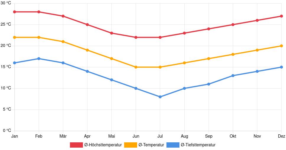 | Ø‑Höchsttemperatur | 28 °C | 28 °C | 27 °C | 25 °C | 23 °C | 22 °C | 22 °C | 23 °C | 24 °C | 25 °C | 26 °C | 27 °C |