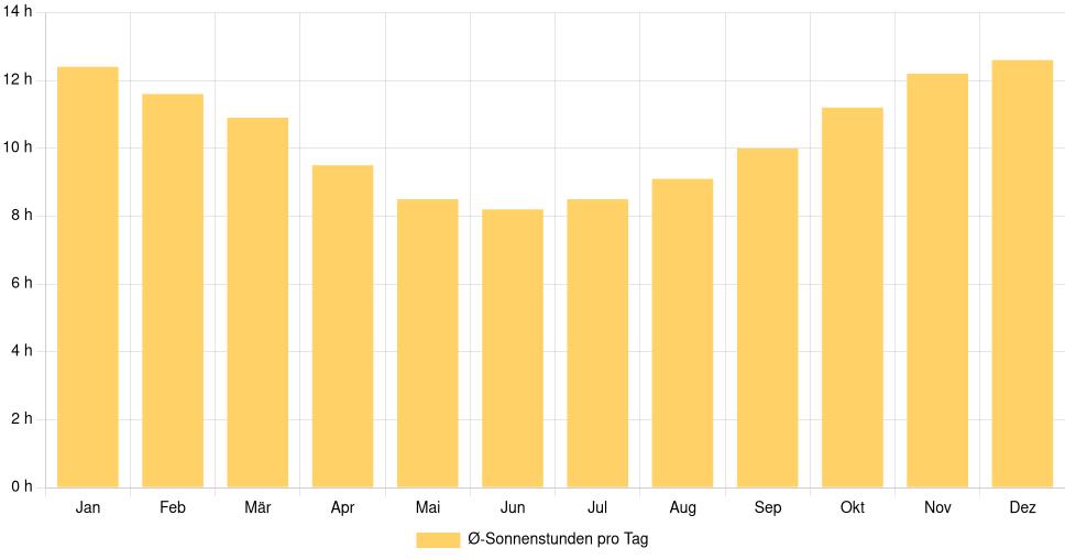 | Ø-Sonnenstunden pro Tag | 12,4 | 11,6 | 10,9 | 9,5 | 8,5 | 8,2 | 8,5 | 9,1 | 10 | 11,2 | 12,2 | 12,6 |