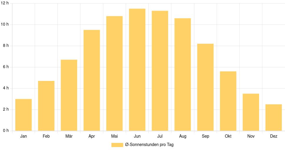 | Ø-Sonnenstunden pro Tag | 3 | 4,7 | 6,7 | 9,5 | 10,8 | 11,5 | 11,3 | 10,6 | 8,2 | 5,6 | 3,5 | 2,5 |