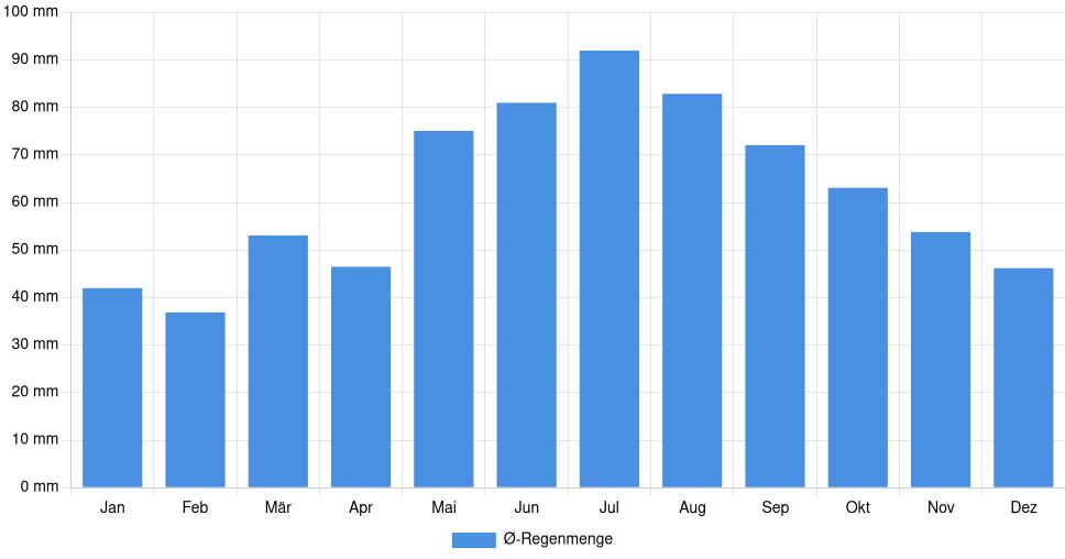 | Regenmenge | 42 mm | 36,9 mm | 53,1 mm | 46,5 mm | 75,1 mm | 81 mm | 92 mm | 82,9 mm | 72,1 mm | 63,1 mm | 53,8 mm | 46,2 mm |