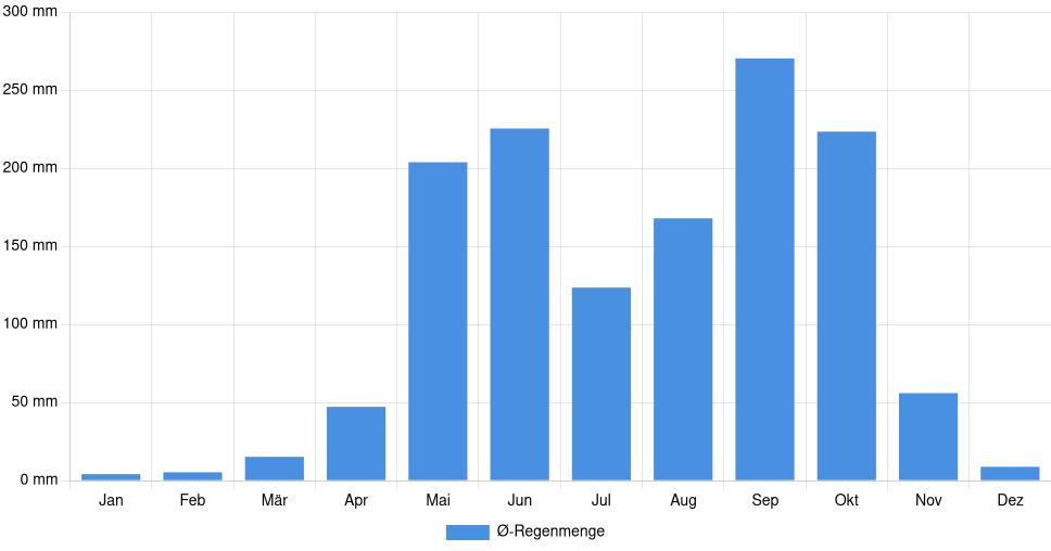 | Regenmenge | 4,2 mm | 5,4 mm | 15,3 mm | 47,3 mm | 204 mm | 225,6 mm | 123,7 mm | 168,1 mm | 270,5 mm | 223,6 mm | 56,1 mm | 8,9 mm |