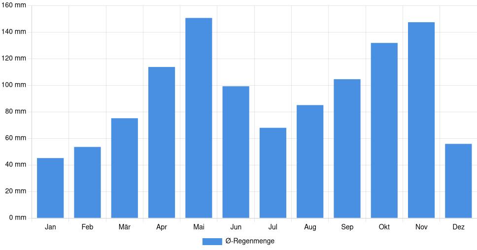 | Regenmenge | 45,2 mm | 53,6 mm | 75,2 mm | 113,8 mm | 150,7 mm | 99,3 mm | 68 mm | 85,1 mm | 104,6 mm | 131,9 mm | 147,5 mm | 55,9 mm |