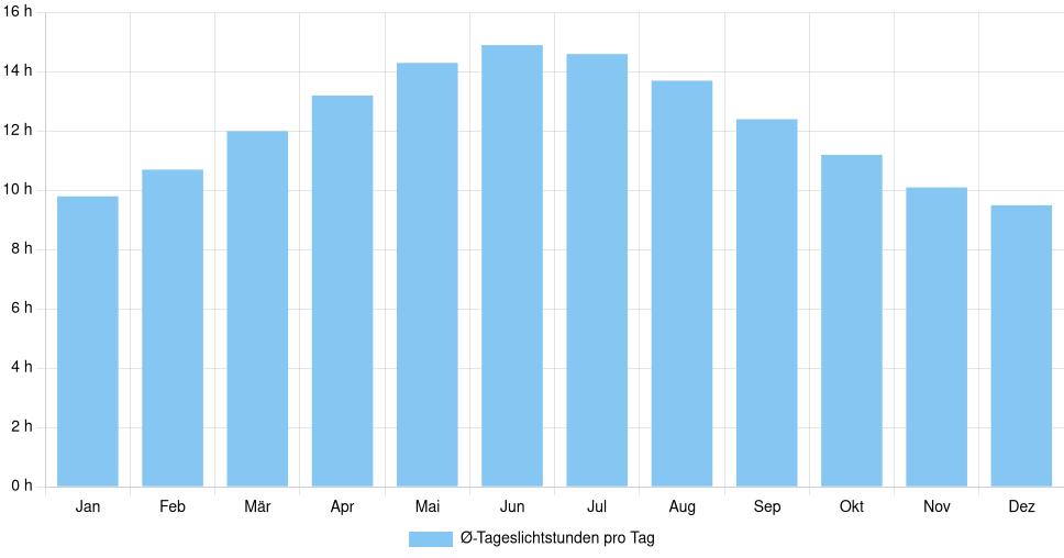 | Ø-Tageslichtstunden pro Tag | 9,8 | 10,7 | 12 | 13,2 | 14,3 | 14,9 | 14,6 | 13,7 | 12,4 | 11,2 | 10,1 | 9,5 |