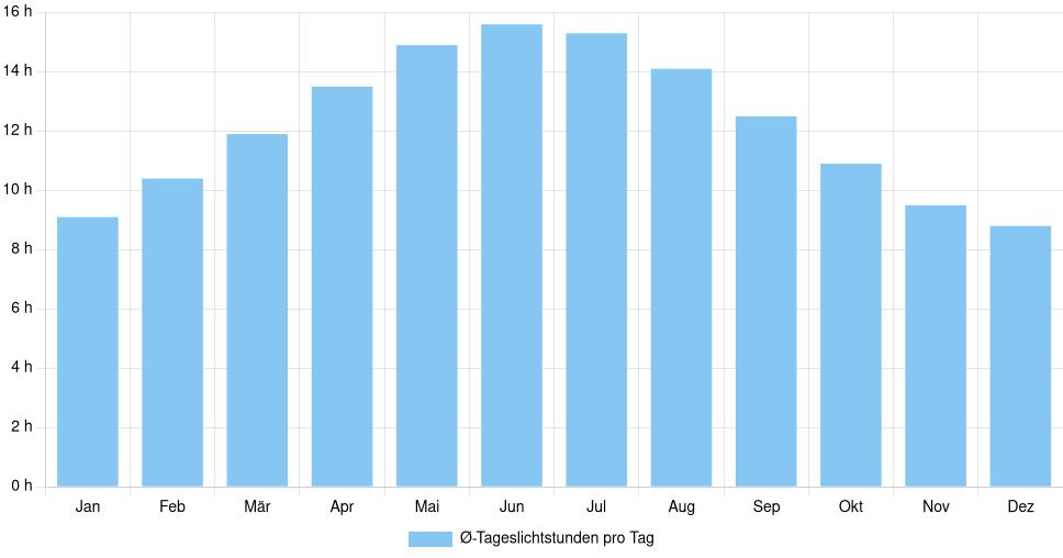 | Ø-Tageslichtstunden pro Tag | 9,1 | 10,4 | 11,9 | 13,5 | 14,9 | 15,6 | 15,3 | 14,1 | 12,5 | 10,9 | 9,5 | 8,8 |