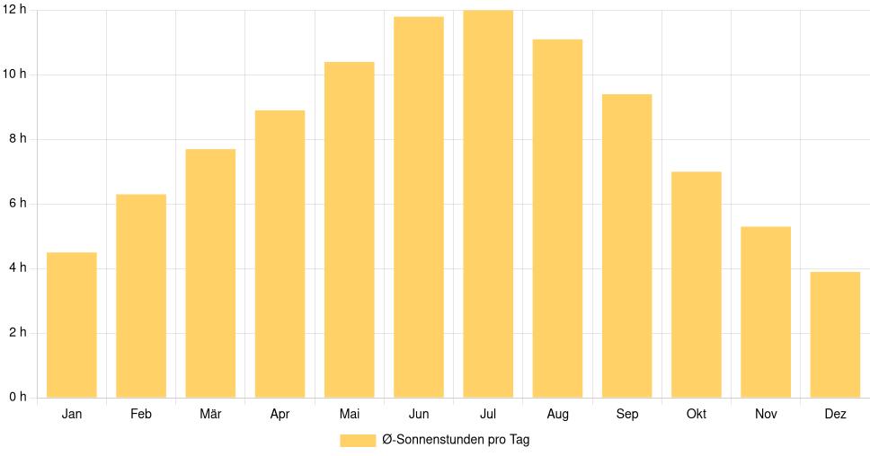 | Ø-Tageslichtstunden pro Tag | 9,4 | 10,5 | 12 | 13,4 | 14,7 | 15,3 | 15 | 13,9 | 12,5 | 11 | 9,7 | 9,1 |