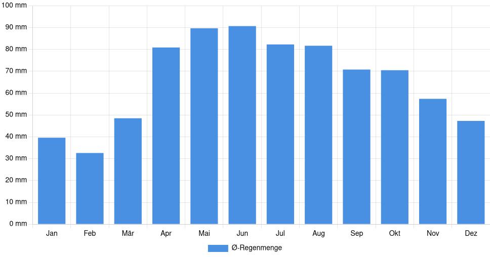 | Regenmenge | 39,6 mm | 32,6 mm | 48,5 mm | 80,9 mm | 89,7 mm | 90,7 mm | 82,3 mm | 81,7 mm | 70,8 mm | 70,5 mm | 57,4 mm | 47,3 mm |