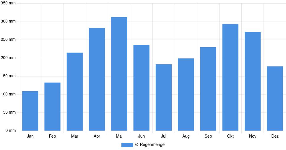 | Regenmenge | 108,9 mm | 132,6 mm | 214,7 mm | 282,4 mm | 312,6 mm | 236 mm | 182,9 mm | 199 mm | 229,6 mm | 293,5 mm | 271,6 mm | 177 mm |