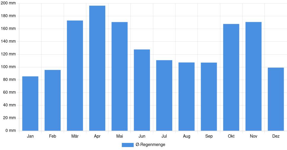 | Regenmenge | 85,5 mm | 95,6 mm | 173,1 mm | 196,4 mm | 170,7 mm | 127,7 mm | 110,9 mm | 107,3 mm | 107,1 mm | 167,7 mm | 170,8 mm | 99,2 mm |