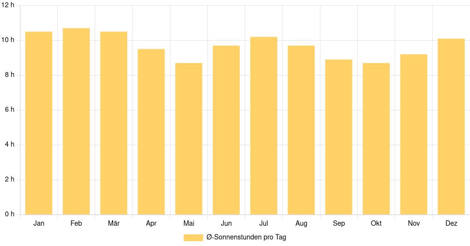 | Ø-Sonnenstunden pro Tag | 10,5 | 10,7 | 10,5 | 9,5 | 8,7 | 9,7 | 10,2 | 9,7 | 8,9 | 8,7 | 9,2 | 10,1 |