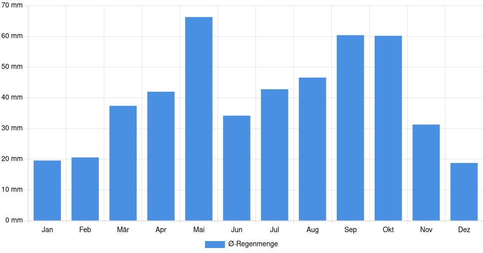 | Regenmenge | 19,6 mm | 20,6 mm | 37,4 mm | 42 mm | 66,3 mm | 34,2 mm | 42,8 mm | 46,6 mm | 60,4 mm | 60,2 mm | 31,3 mm | 18,8 mm |