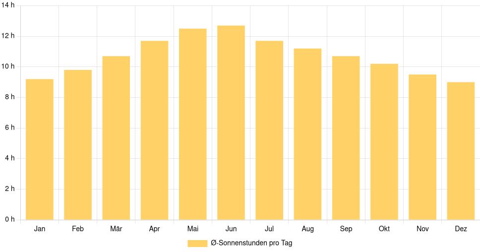 | Ø-Sonnenstunden pro Tag | 9,2 | 9,8 | 10,7 | 11,7 | 12,5 | 12,7 | 11,7 | 11,2 | 10,7 | 10,2 | 9,5 | 9 |