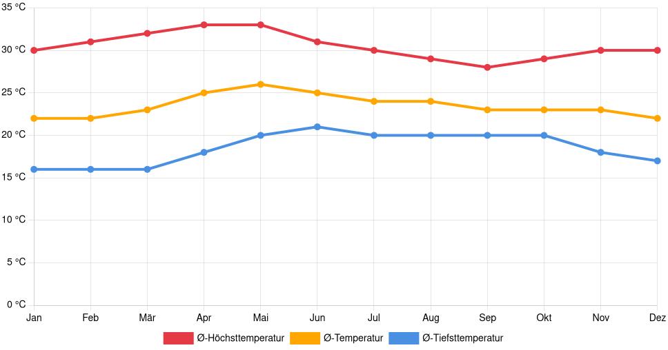 | Ø‑Höchsttemperatur | 30 °C | 31 °C | 32 °C | 33 °C | 33 °C | 31 °C | 30 °C | 29 °C | 28 °C | 29 °C | 30 °C | 30 °C |