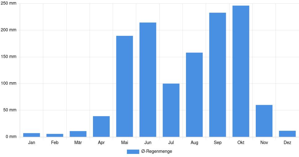 | Regenmenge | 7,2 mm | 5,8 mm | 11 mm | 39 mm | 189,5 mm | 214,4 mm | 100 mm | 158 mm | 232,8 mm | 246,1 mm | 60 mm | 11,6 mm |