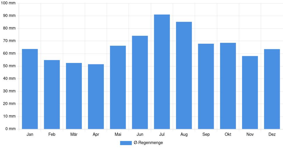 | Regenmenge | 63,7 mm | 54,9 mm | 52,6 mm | 51,6 mm | 66,3 mm | 74,2 mm | 91,1 mm | 85,3 mm | 67,9 mm | 68,6 mm | 58,1 mm | 63,6 mm |