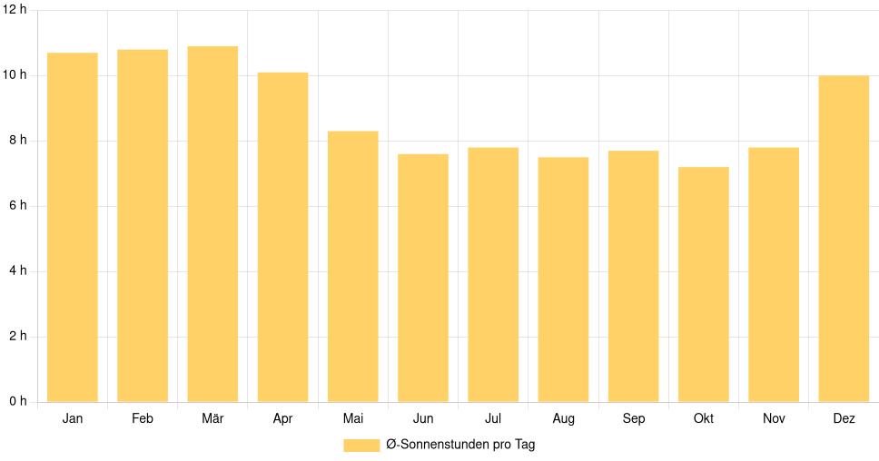 | Ø-Sonnenstunden pro Tag | 10,7 | 10,8 | 10,9 | 10,1 | 8,3 | 7,6 | 7,8 | 7,5 | 7,7 | 7,2 | 7,8 | 10 |