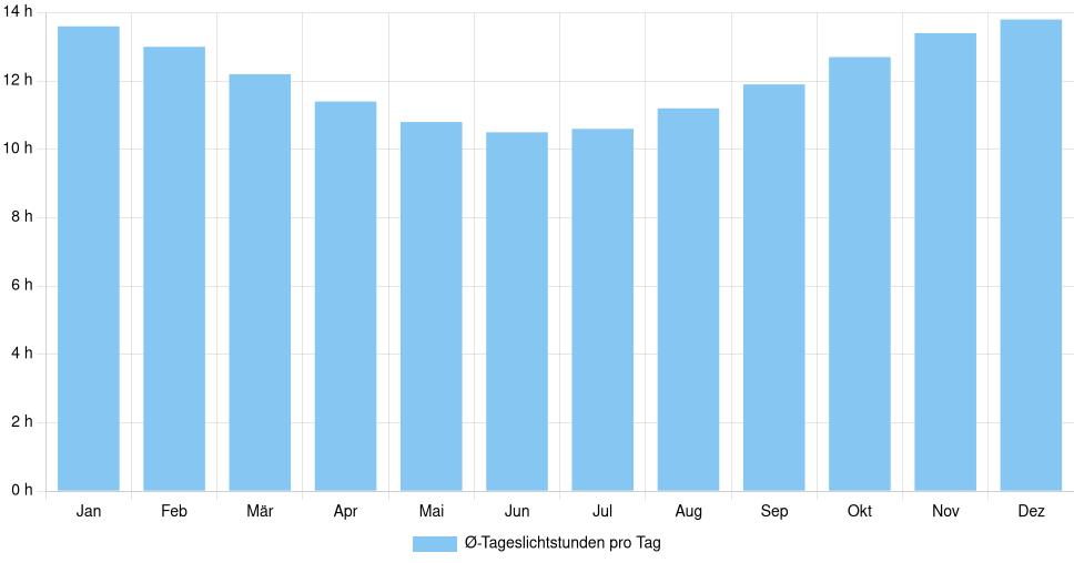 | Ø-Tageslichtstunden pro Tag | 13,6 | 13 | 12,2 | 11,4 | 10,8 | 10,5 | 10,6 | 11,2 | 11,9 | 12,7 | 13,4 | 13,8 |