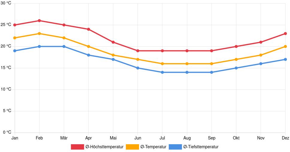| Ø‑Tiefsttemperatur | 19 °C | 20 °C | 20 °C | 18 °C | 17 °C | 15 °C | 14 °C | 14 °C | 14 °C | 15 °C | 16 °C | 17 °C |