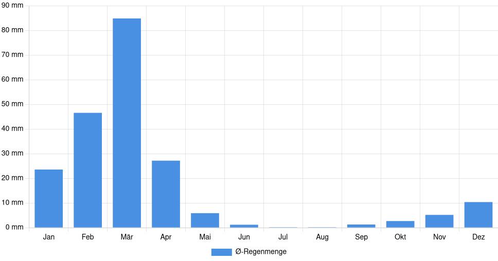 | Regenmenge | 23,6 mm | 46,6 mm | 84,9 mm | 27,2 mm | 5,9 mm | 1,2 mm | 0,2 mm | 0,2 mm | 1,3 mm | 2,7 mm | 5,2 mm | 10,4 mm |