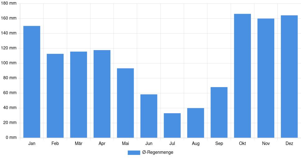 | Regenmenge | 150 mm | 112,6 mm | 115,6 mm | 117,6 mm | 93,2 mm | 58,3 mm | 33 mm | 39,9 mm | 68 mm | 166,2 mm | 159,9 mm | 164,2 mm |