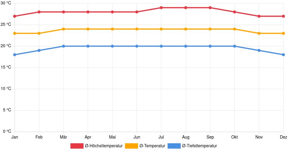 | Ø‑Höchsttemperatur | 27 °C | 28 °C | 28 °C | 28 °C | 28 °C | 28 °C | 29 °C | 29 °C | 29 °C | 28 °C | 27 °C | 27 °C |