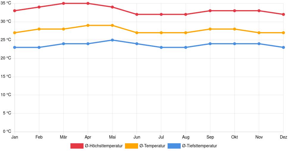 | Ø‑Höchsttemperatur | 33 °C | 34 °C | 35 °C | 35 °C | 34 °C | 32 °C | 32 °C | 32 °C | 33 °C | 33 °C | 33 °C | 32 °C |