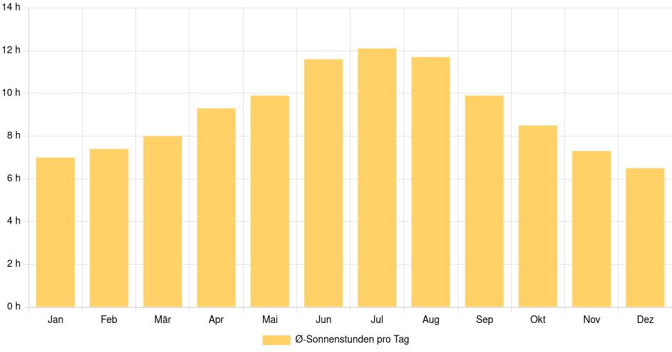 | Ø-Sonnenstunden pro Tag | 7 | 7,4 | 8 | 9,3 | 9,9 | 11,6 | 12,1 | 11,7 | 9,9 | 8,5 | 7,3 | 6,5 |