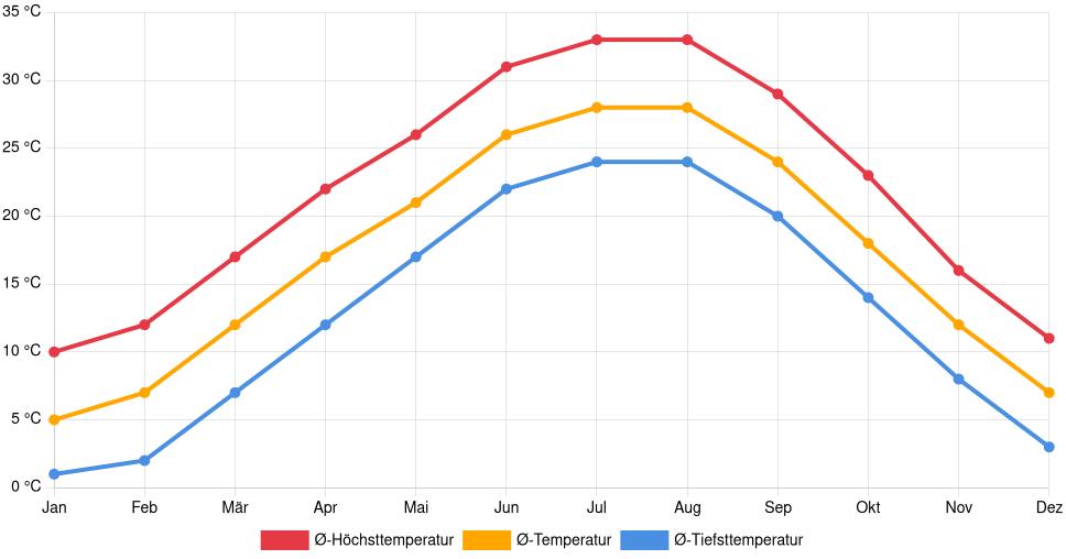 | Ø‑Höchsttemperatur | 10 °C | 12 °C | 17 °C | 22 °C | 26 °C | 31 °C | 33 °C | 33 °C | 29 °C | 23 °C | 16 °C | 11 °C |