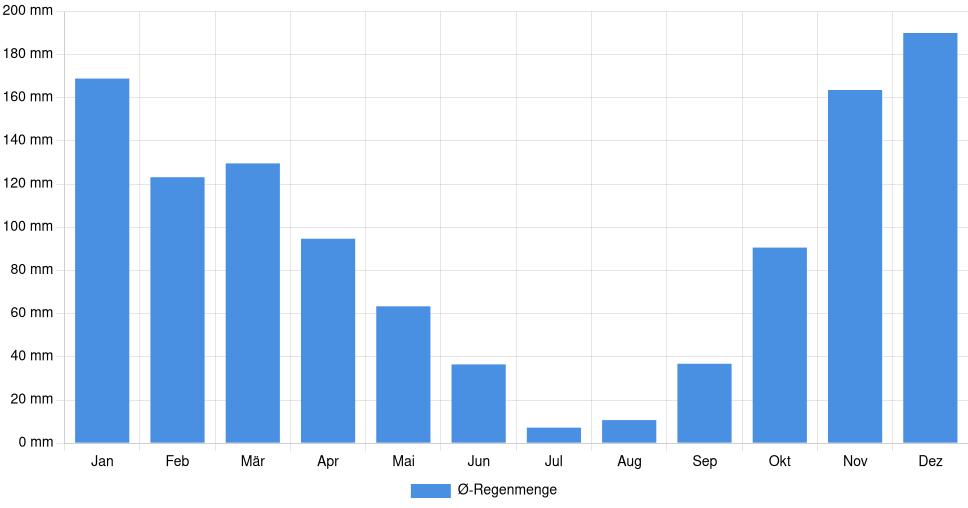 | Regenmenge | 168,9 mm | 123,2 mm | 129,6 mm | 94,7 mm | 63,4 mm | 36,5 mm | 7,2 mm | 10,7 mm | 36,8 mm | 90,6 mm | 163,6 mm | 190 mm |