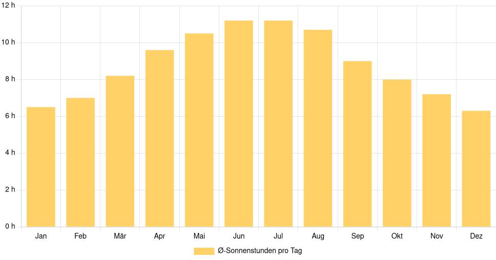 | Ø-Sonnenstunden pro Tag | 6,5 | 7 | 8,2 | 9,6 | 10,5 | 11,2 | 11,2 | 10,7 | 9 | 8 | 7,2 | 6,3 |
