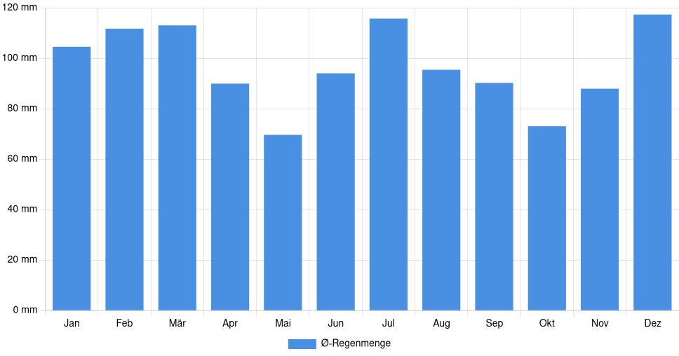 | Regenmenge | 104,6 mm | 111,8 mm | 113,1 mm | 90 mm | 69,7 mm | 94,1 mm | 115,8 mm | 95,5 mm | 90,3 mm | 73,1 mm | 88 mm | 117,4 mm |
