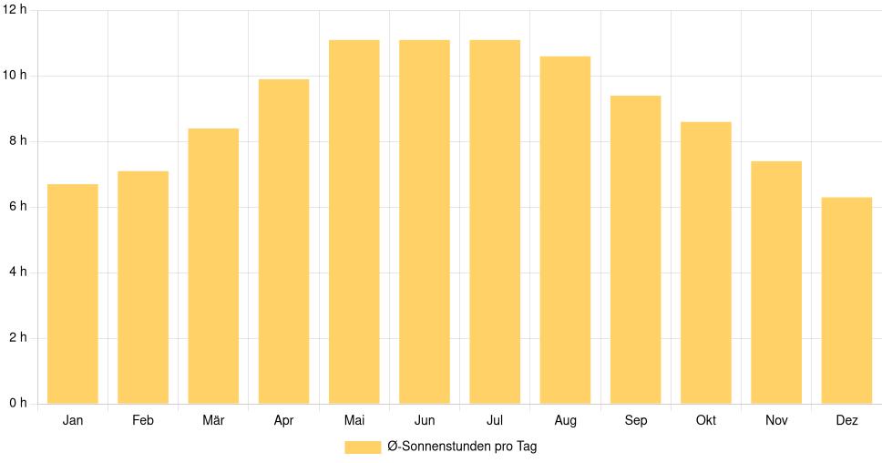 | Ø-Sonnenstunden pro Tag | 6,7 | 7,1 | 8,4 | 9,9 | 11,1 | 11,1 | 11,1 | 10,6 | 9,4 | 8,6 | 7,4 | 6,3 |