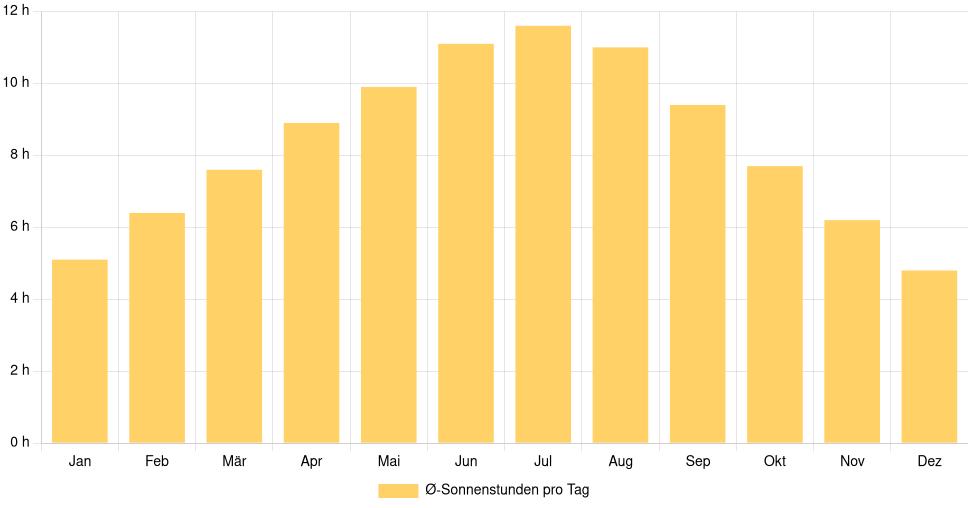 | Ø-Sonnenstunden pro Tag | 5,1 | 6,4 | 7,6 | 8,9 | 9,9 | 11,1 | 11,6 | 11 | 9,4 | 7,7 | 6,2 | 4,8 |