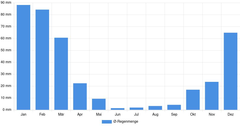 | Regenmenge | 88,2 mm | 84,3 mm | 60,7 mm | 22,4 mm | 9,4 mm | 1,5 mm | 2 mm | 3,3 mm | 4,3 mm | 17 mm | 23,6 mm | 64,9 mm |