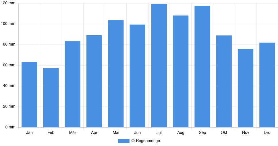 | Regenmenge | 63,2 mm | 57,3 mm | 83,3 mm | 89,1 mm | 103,7 mm | 99,4 mm | 119,3 mm | 108,2 mm | 117,6 mm | 88,9 mm | 75,8 mm | 81,9 mm |
